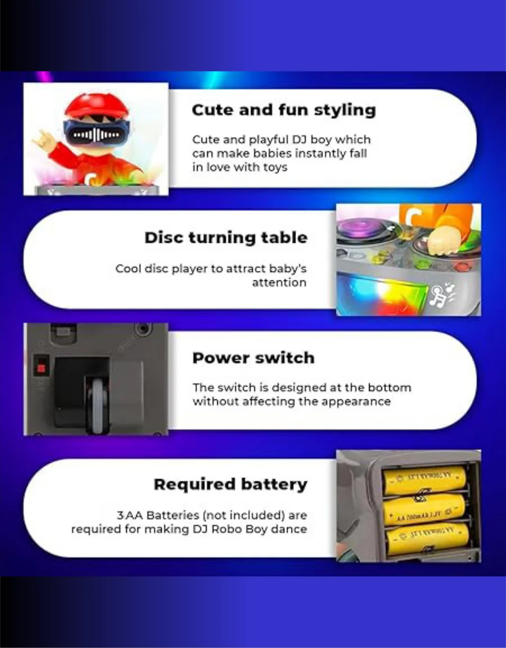 Bring home the party with this fun and interactive DJ Music Toy for Kids! Designed to entertain and engage, this dancing DJ robot toy combines music, colorful flashing lights, and dynamic dance moves to create a mini disco right at home. Kids will love the realistic DJ turntable, cool robot design, and vibrant sound effects. This toy encourages imaginative play, promotes auditory and visual development, and keeps kids active and entertained. Perfect as a birthday gift, party toy, or educational musical toy for toddlers and young kids.